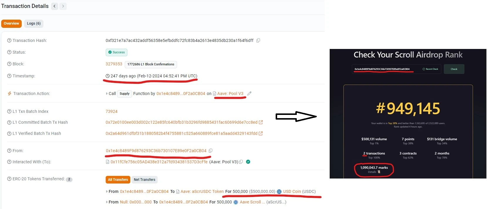 该地址最初的资金来源于「团队地址#1 」 ,该地址在 Scroll 上有 2 笔交易 —— 2 月 12 日批准并向 Aave 存入了 50 万枚 USDC。