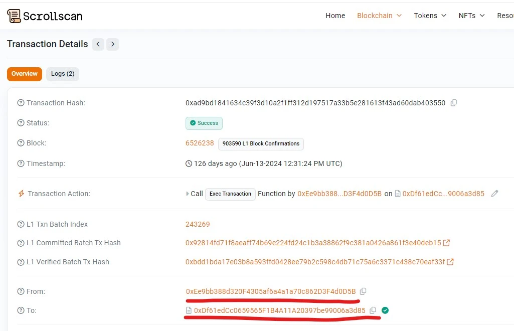 该地址是归属于 Scroll 团队的一个多签智能合约地址(合约由 scrup.eth 部署),且曾与「团队地址#1 」有过 100 ETH 的资金往来。