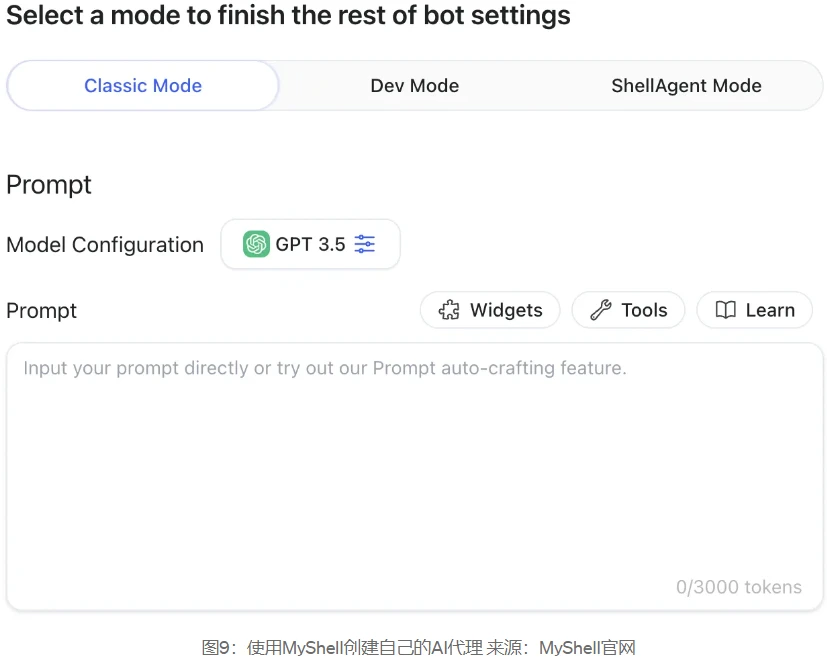 在 MyShell 的创作工坊(Workshop)可以看到支持用户以三种模式进行 AI 机器人的构建,对于专业开发人员和普通用户来说都可以匹配合适的模式,使用经典模式设置模型参数和指令,可以集成到社交媒体软件上;开发模式则需要用户上传自己的模型文件;使用 ShellAgent 模式可以以无代码的形式构建 AI 机器人。