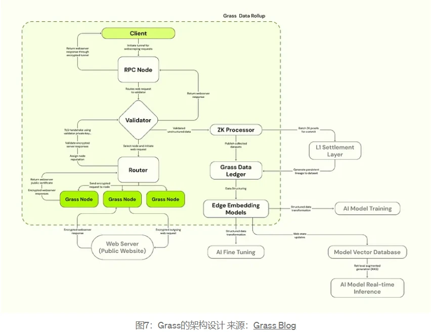 如图所示,客户发出 Web 请求,这些请求会通过验证器并最终路由到 Grass 节点,网站的服务器都会响应网页请求,允许其数据被抓取并返回。ZK 处理器的目的是帮助记录在 Grass 网络上抓取的数据集的来源。 这意味着每当一个节点抓取网络时,他们都可以在不透露任何关于自己的身份信息的情况下获得他们的奖励。计入数据账本之后,通过图嵌入模型(Edge Embedding)对收集到的数据进行清洗、结构化,用于 AI 训练。