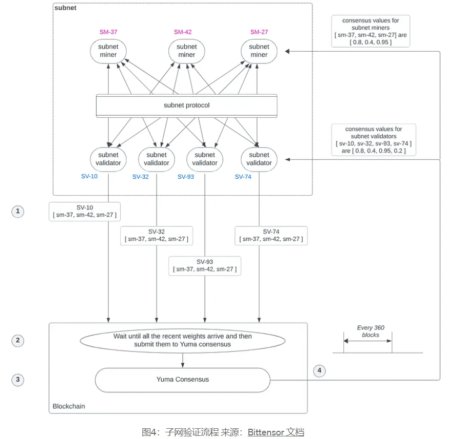 每个子网验证器都维护一个权重向量。向量的每个元素表示分配给子网矿工的权重,这个权重是根据子网验证器对矿工任务完成度的评价来确定的。每个子网验证器通过该权重向量对所有子网矿工进行排序且独立运行,将其矿工排名权重向量传输到区块链。通常,每个子网验证器每 100 – 200 个区块向区块链传输更新的排名权重向量。
