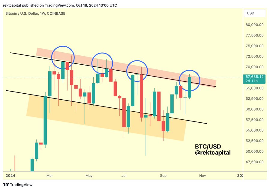 同时,交易员 Rekt Capital 也 表示 ,目前比特币的上涨势头并不意味著正式突破阻力、即将迎来暴涨,相反,从技术指标来看,比特币还在尝试突破自己自 3 月份以来的下行趋势。且在过去数个月内,比特币已经两度做出尝试,但最终未能突破,此次是否将正式突破这一关键阻力位,还有待继续观察: