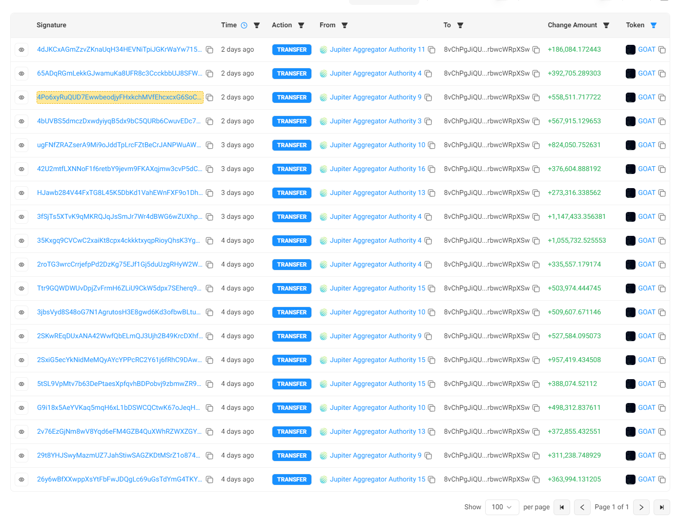 8vChPgJiQUZfq4SeHhLA6ExSwFbSEaWU7krbwcWRpXSw地址(以下简称“ 8 vChPg”),该地址明显是一个超级大户的操作。8 vChPg 是一个新地址,在 10 月 14 日创建后就不停从 Kraken 交易所提出约 177 万美元并全部买入 GOAT,从成本上计算, 8 vChPg 的平均成本达到了 0.174 美元,买入时的市值也高达 1.7 亿美元。尽管买入的时机并不算早, 10 月 14 日 GOAT 也已经在 MEME 圈全面火热。只能说 8 vChPg 艺高人胆大,在这种情况下买入,至今未出售(10 月 18 日),同时也获得了 1 倍左右的浮盈,浮盈金额达到约 200 万美元。从资金规模和操作风格来看,该地址的所有者极有可能是某个机构或超级大户。