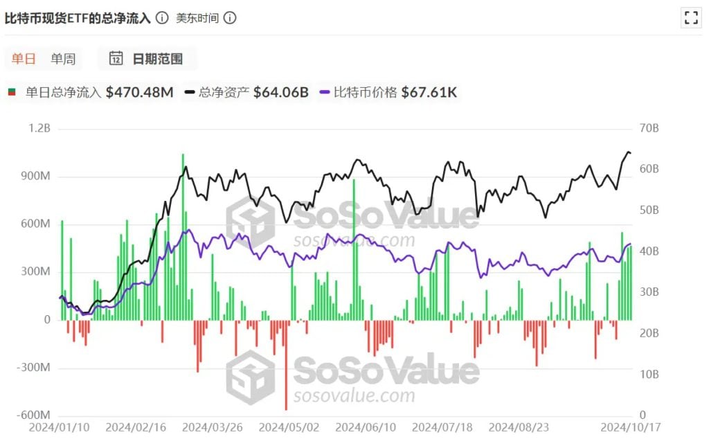 从现货 ETF 正式上缐𫔭始,目前总净流入已达到 206.6 亿美元。值得注意的是,从 10 月 1 日至今,共计 6 日净流出, 但有 7 日净流入,且净流入额数量之大,并不多。10 月 14 日,净流入超 5.55 亿美元, 10 月 16 日与 17 日,净流入均超 4.5 亿美元, 10 月 15 日净流入超 3.7 亿美元。