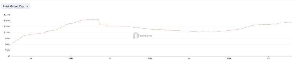 稳定币总市值在 2022 年年中曾创下 1863 亿美元的历史高点,随后不断滑落,但总体而言维持在 1200 亿美元上方。时间快进至 2023 年 10 月,资金流入不断加速,目前稳定币总市值已经超 1723 亿美元,