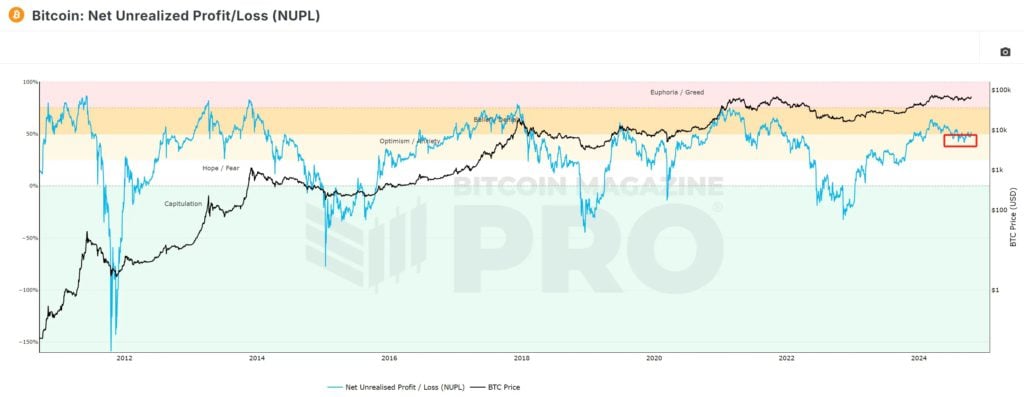 比特币未实现净利润 / 亏损,该指标主要用来衡量比特币链上玩家的盈利 / 亏损情况。我们可以看到其行列颜色从上到下依次为红、橙、浅黄、灰白和浅蓝。其中最底部蓝色代表大多数人亏损割肉,而顶部的红色则代表大多数玩家处于盈利。