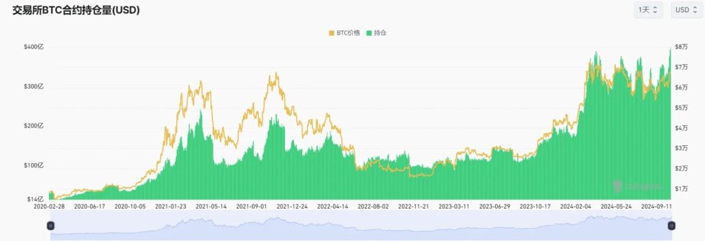 今日,据 Coinglass 资料显示,全网比特币未平仓合约持仓量升至 397 亿美元上方,创下历史新高。