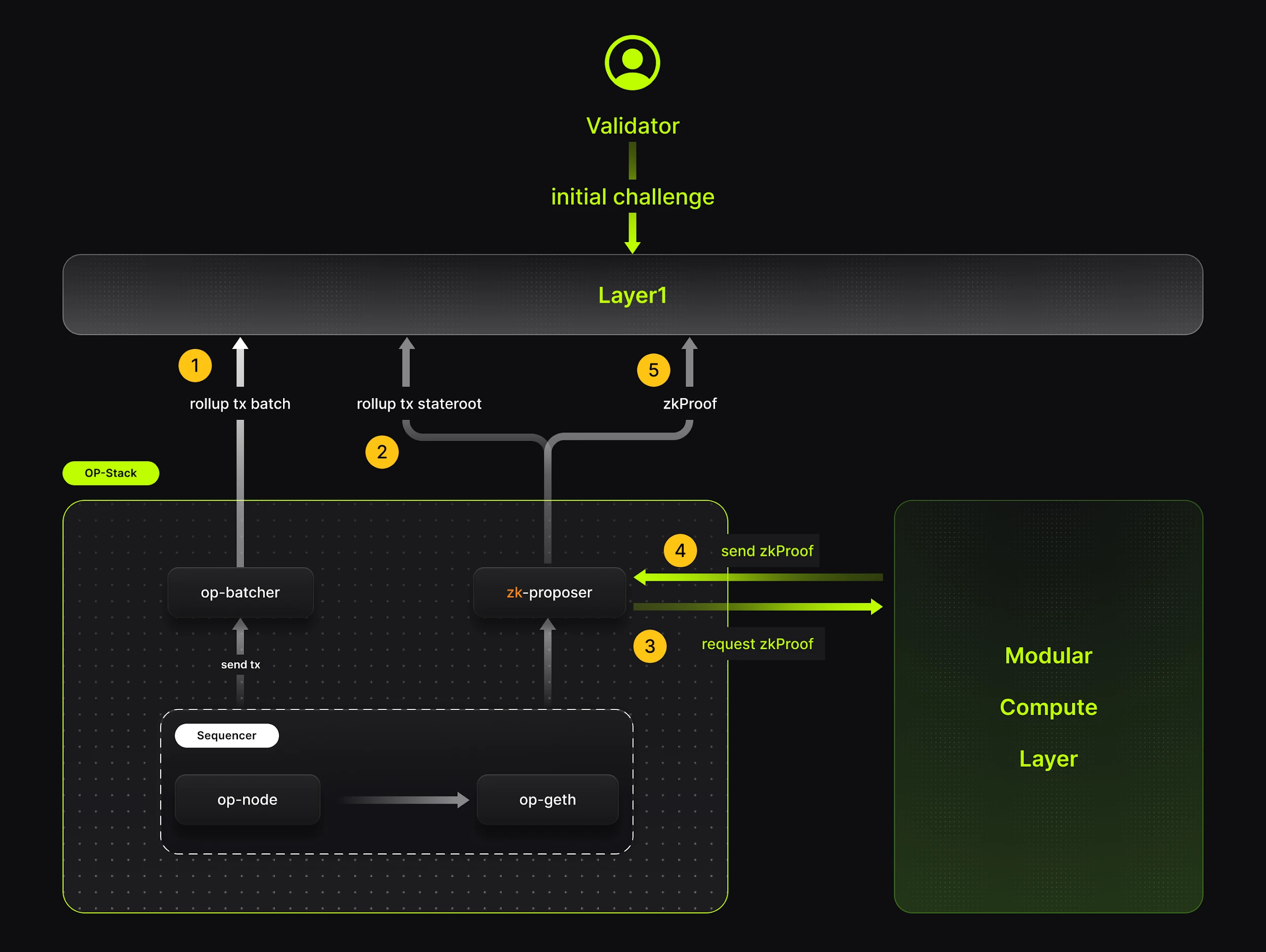 Lumoz 最新的优化方案将对原有的架构设计进行改进,把整个 ZK-Fraud Proof 模块整合进了 op-proposer 组件升级为 zk-proposer,从而显著简化了节点维护的复杂度。在这一新方案中,zk-proposer 在保留原有的功能的基础上,新增了一个 ZK 交互选项。这一选项使得 proposer 能够根据链上数据的执行结果,直接向算力网络层发起 Proof 生成请求,并将生成的 Proof 提交到链上进行验证。