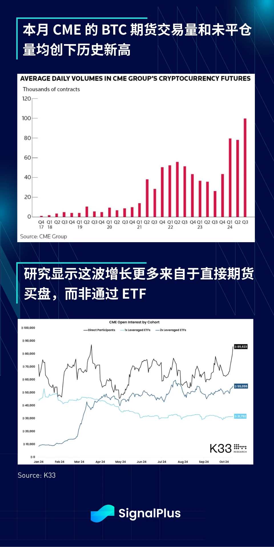 令人振奋的是,BTC 资金流入的增加与芝加哥商品交易所(CME)衍生品交易活动的显著增长同时发生,CME 期货未平仓量超过 115 亿美元,达到历史新高。此外,根据 K 33 的研究,CME 未平仓量的增长是由“直接参与者”所推动,而非杠杆资金流入,这呈现一个更健康的看涨结构和更积极的买入倾向。另外,考虑到传统金融(TradFi)参与者在中心化交易所进行交易多半受限,CME 交易活动的激增也表明了更多主流和 TradFi 参与者的加入。