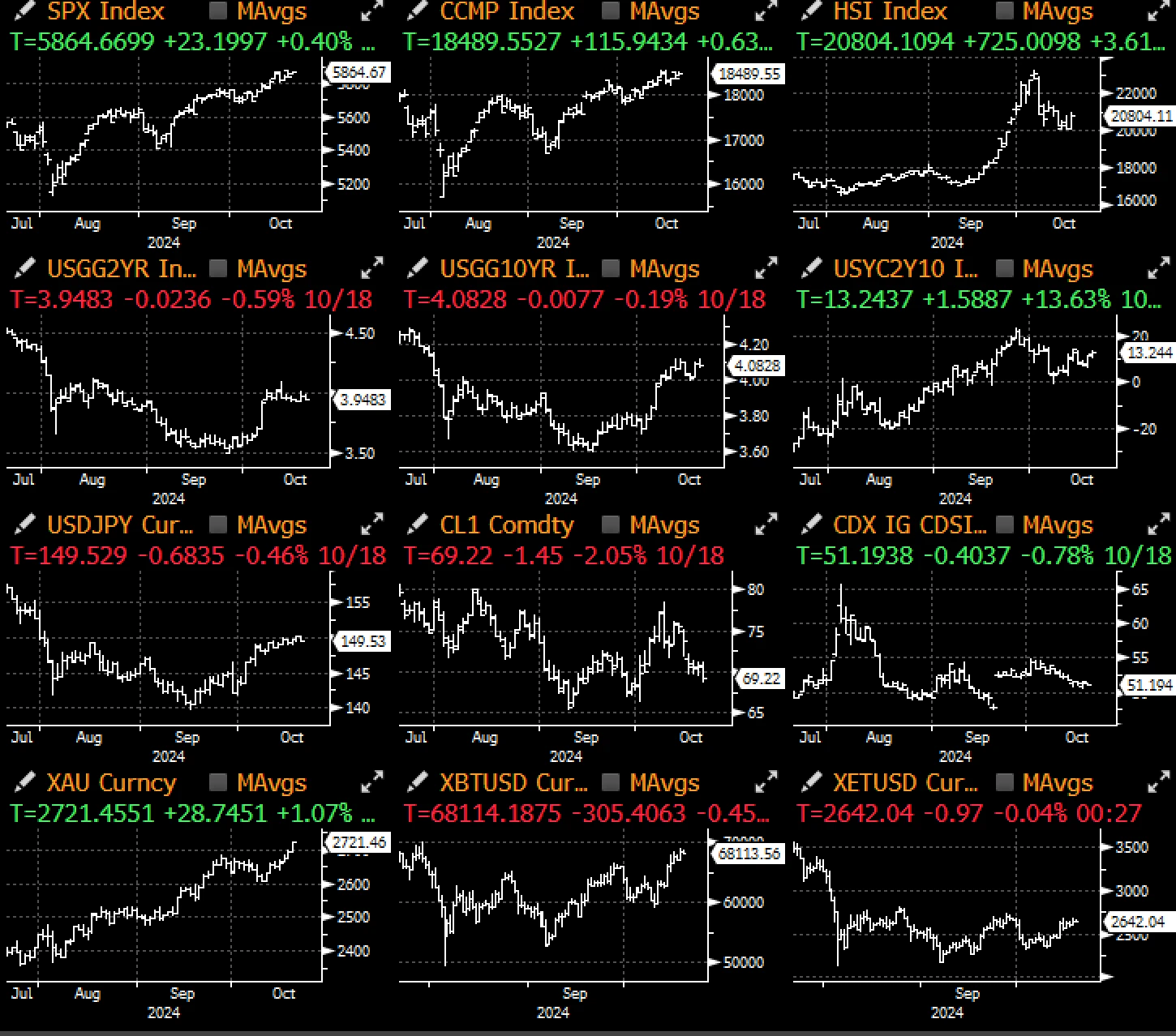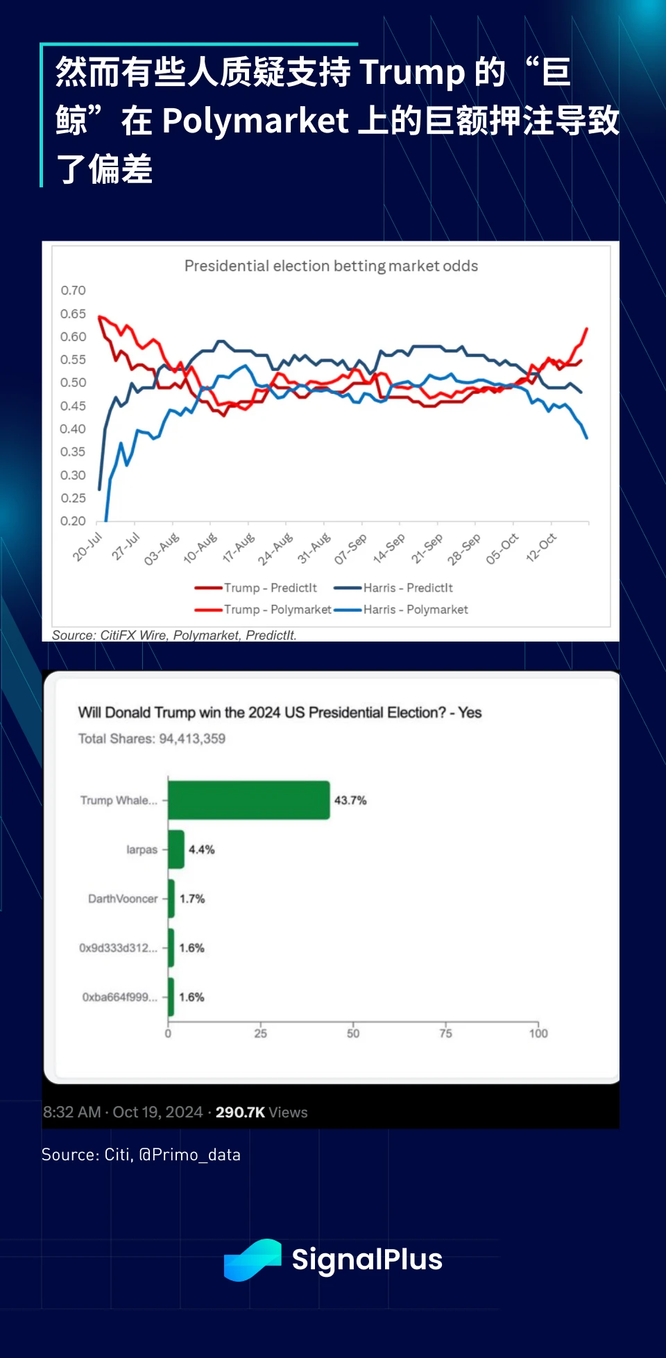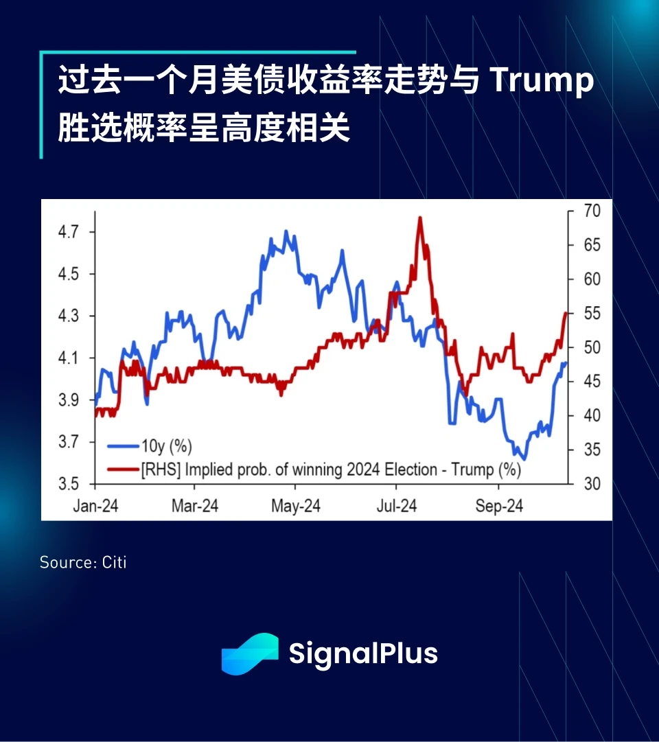 近期的焦点自然集中在美国大选上,最近有很多关于 Polymarket 的预测(Trump 胜选概率 60% )与传统预测(仍接近 50/50)出现分歧的讨论,无论细节如何,宏观资产交易可能会带著 Trump 胜选的倾向进入 11 月,随著债券交易员普遍预期 Trump 在第二任期会更加积极推动财政支出,近期美债收益率走势与 Trump 胜选概率显示出极高的关联性。