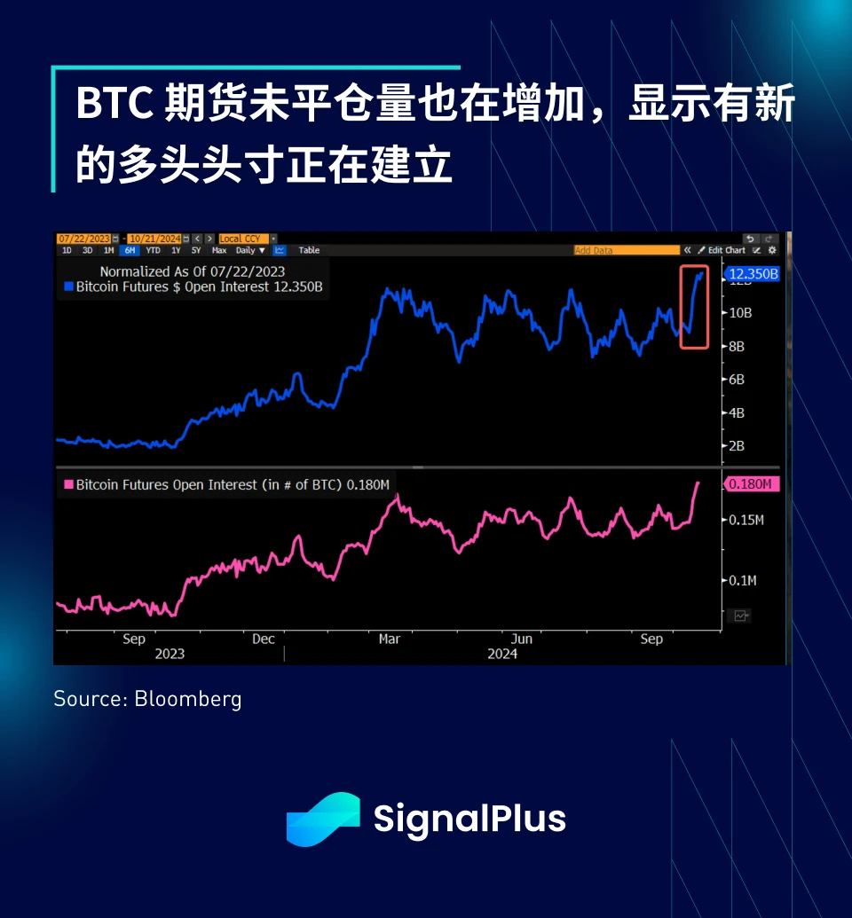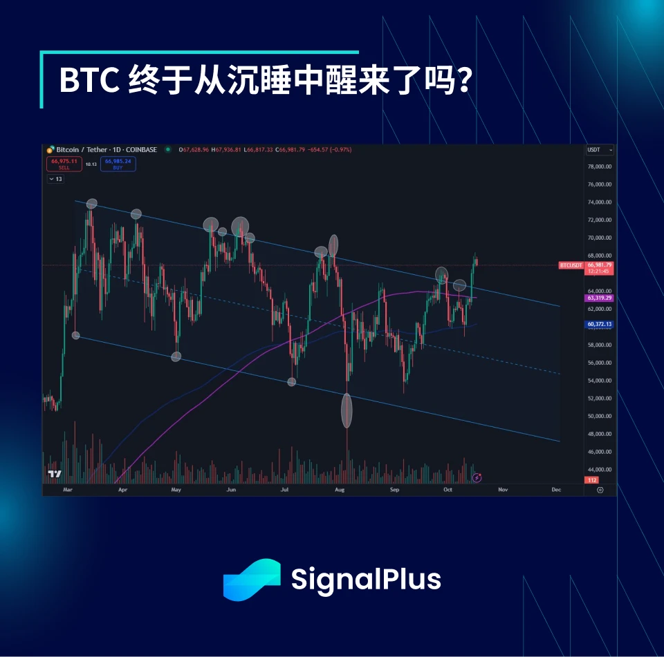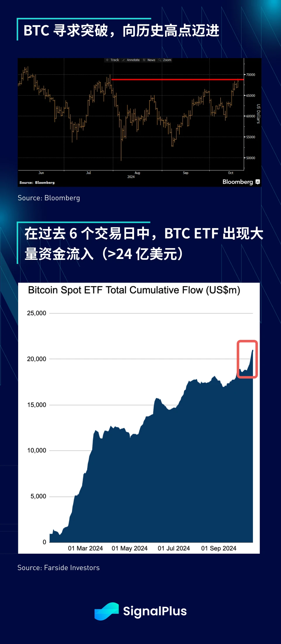 BTC 似乎正从长期沉睡中苏醒,突破其下行通道,并寻求在大选前挑战历史高点。价格在近期突破 6.8 万美元,同时 ETF 在过去 6 个交易日有约 24 亿美元的资金流入,而 BTC 期货未平仓量也相应激增,这可能是市场正在建立新多头头寸的正向指标。