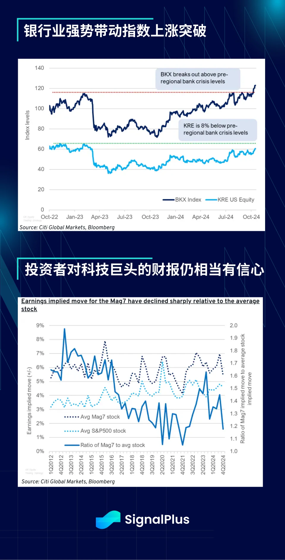 财报季的表现也有利于市场,美国银行业、Netflix 和台积电(上涨 9.8% )的业绩都远超预期,SPX 指数连续 6 周上涨,创下今年以来最佳的连续上涨纪录,而投资者仍对市场和企业获利充满信心,期权隐含的财报日波动较近期平均水平低约 5% 。