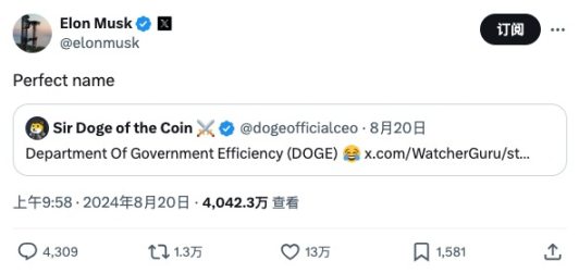 而 D.O.G.E 这个名称的来源,也确实来自于 DOGE 社区。马斯克与 8 月 20 日在官方 X 账户中回复了@Sir Doge Of the coin 的内容,这个名字应该为其设计该部门名称提供了灵感。