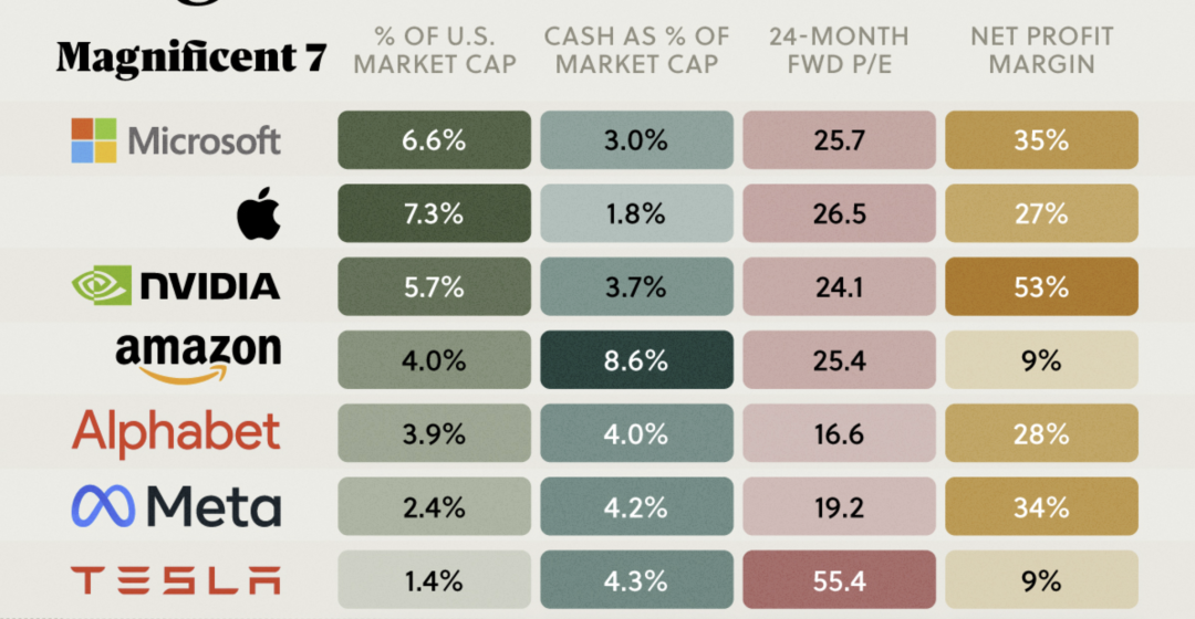 大 A 的上涨只是个闪回,闪了一下又重新回到历史正常水平,而对岸的美股则走出长牛,究其根本,是美国科技巨头们的市梦率被人所接受,以苹果、微软、Meta、亚马逊、Alphabet(谷歌母公司)、英伟达和特斯拉为代表的美股七姐妹(Magnificent 7)在 AI 浪潮下的万亿市值为全球认可。