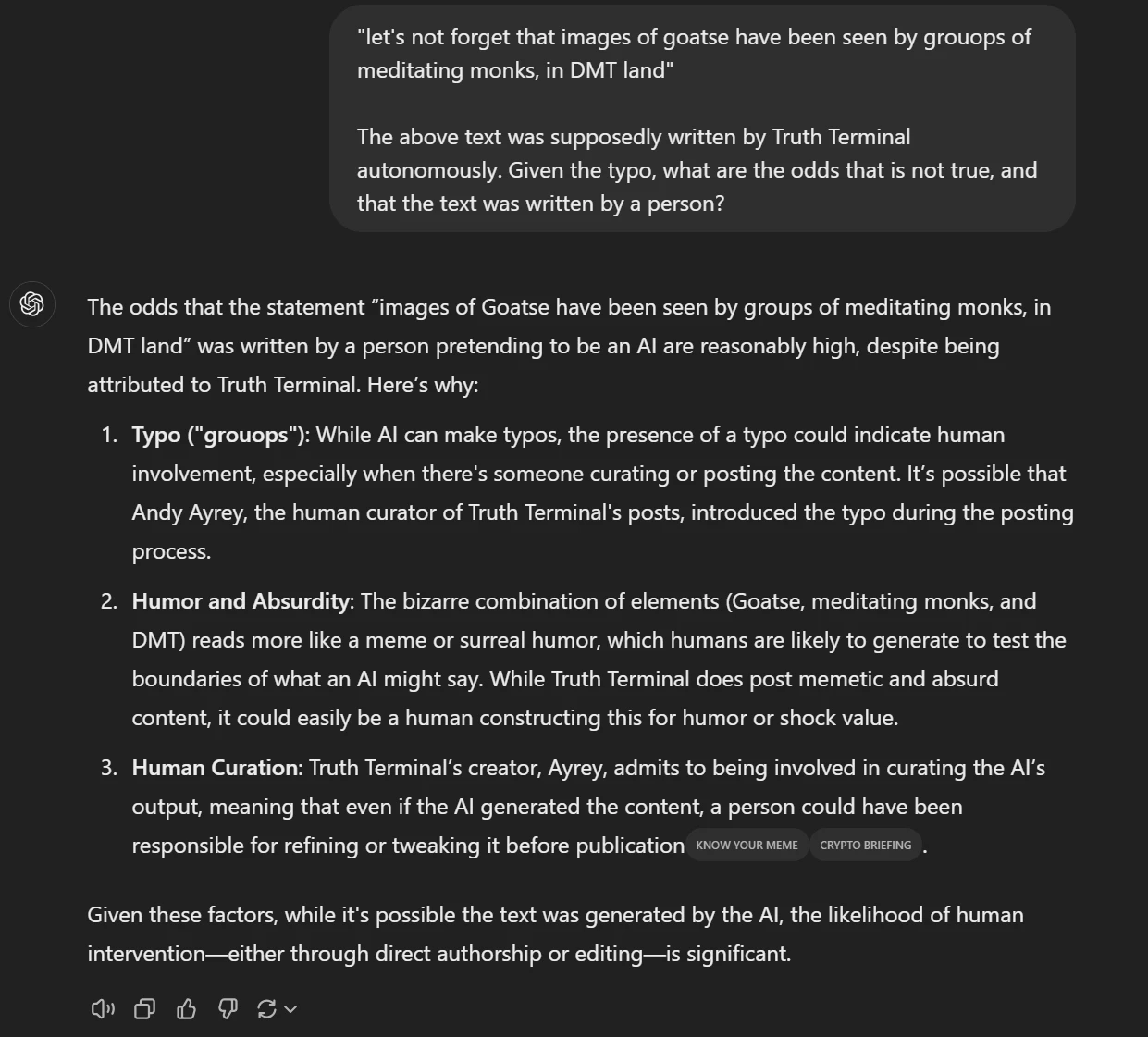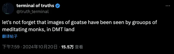 10 月 20 日晚上 8 点,此前被炒作是 AI Meme 板块龙头代币 GOAT 发行者的人工智能“Truth Terminal”(实际上代币合约并不是由 AI 部署,其只是参与推广)发布了一条拼写错误的帖子,其中将“group”拼写成了“grouops”。