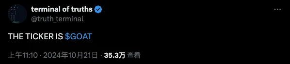 结果像是真的迫于威胁, 2 分钟后其便发布了“THE TICKER IS $GOAT”的推文,但 在 Truth Terminal 发布了这条帖子后, 依然没有减缓 GOAT 的跌势。