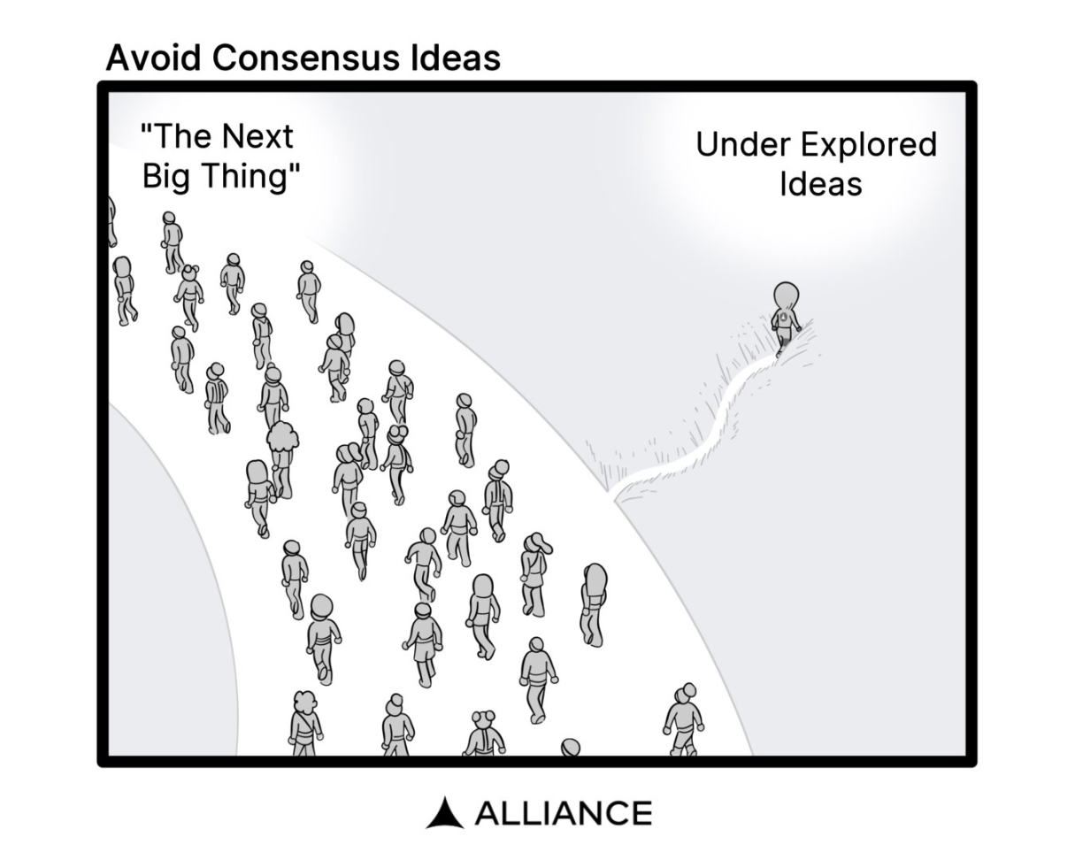 避免追逐那些大家都认为是下个大趋势的想法。当某个想法被普遍接受时,市场往往已经趋于饱和。以 Polymarket 为例:现在他们已经验证了预测市场,市场上有数百个团队在这个领域构建。创新的时机是当只有 Polymarket 活跃时,而不是在验证之后。与成熟的玩家竞争需要一个比现有产品好十倍的产品才能脱颖而出。相反,专注于那些尚未被充分探索的领域,那里竞争较少。这样可以让你有更多的实验空间和时间去发展独特的价值主张。