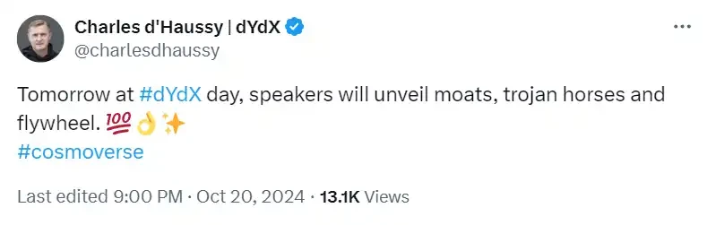 dydx 在前 CEO Antonio Juliano 宣布回归后只涨了差不多 25%,但在 dydx 基金会 CEO Charles d'Haussy 这条「在明天的 dYdX Day 活动中,演讲者将揭示关于护城河、特洛伊木马和飞轮的秘密」的推文后,瞬间又涨了 20%,不少人猜测 dydx 也要做自己的「pump.fun」。
