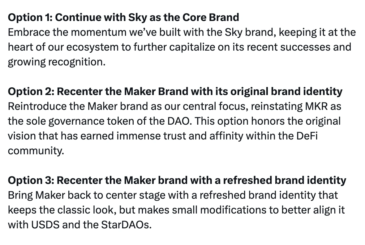 在阐述完自身设想之后,Rune 还提到希望社区就重启 Maker 品牌的潜在可能性进行投票,当年拟议的几种选项如下: