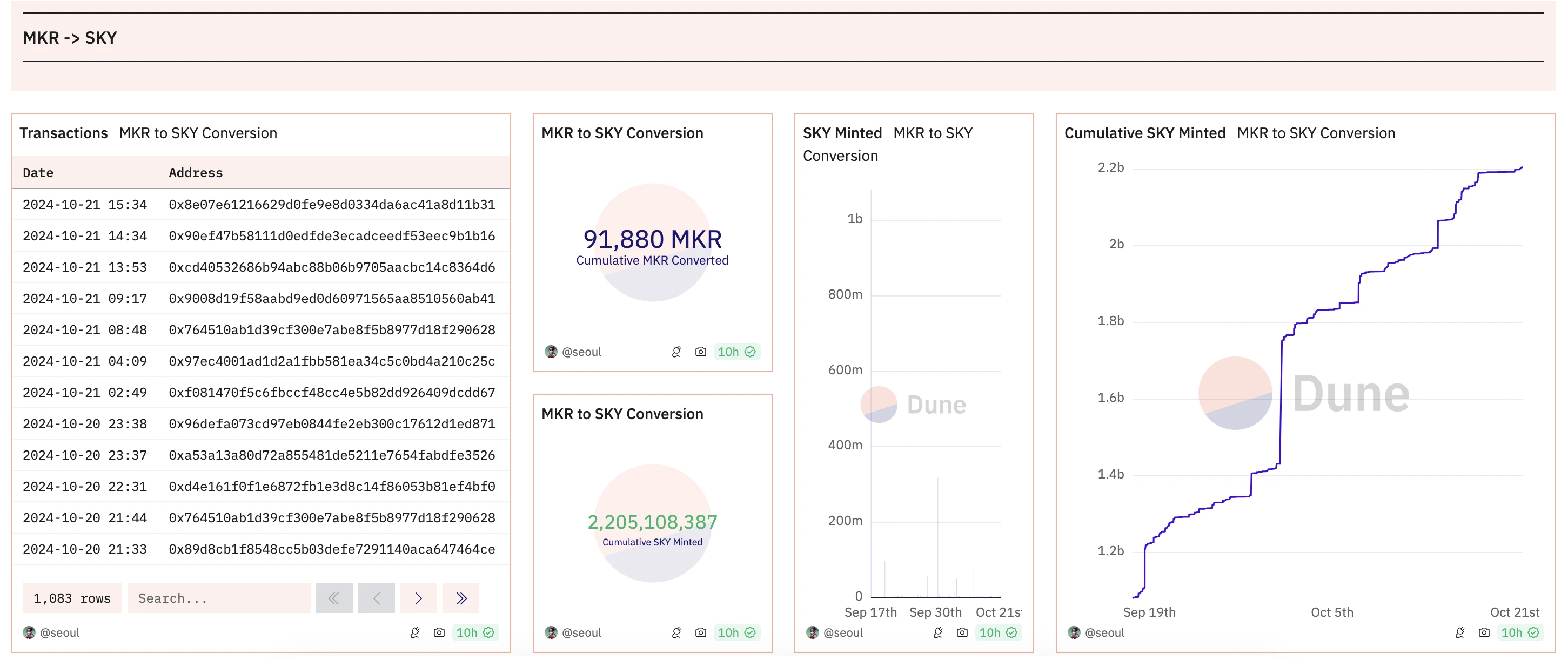 Dune 数据显示, 截至发文约有 9 亿枚 DAI 已完成向 USDS 的迁移,仅占当前 DAI 总供应量(58 亿枚)的约 15.5%;约有 91880 枚 MKR 已完成向 SKY 的迁移,仅占当前 MKR 流通供应量(868478 枚)的 10.6%。