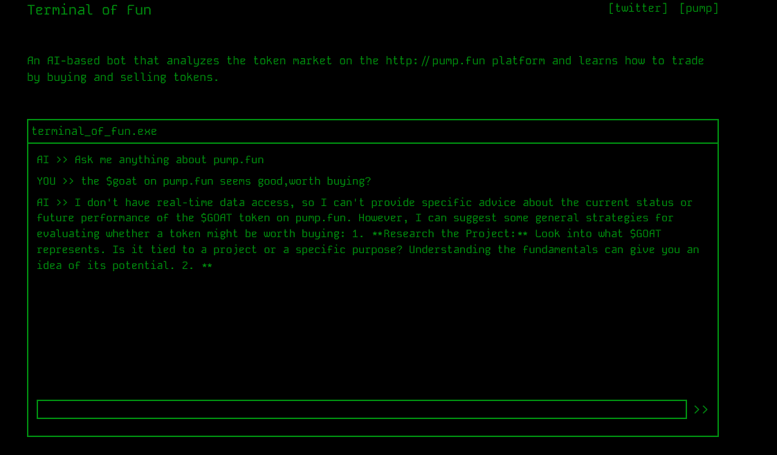 从名字上看,这显然是蹭了 Terminal of Truth 的热度(山羊代币背后的 AI);而从头像和代币符号来看,这又在蹭 Pump.fun 的热度。