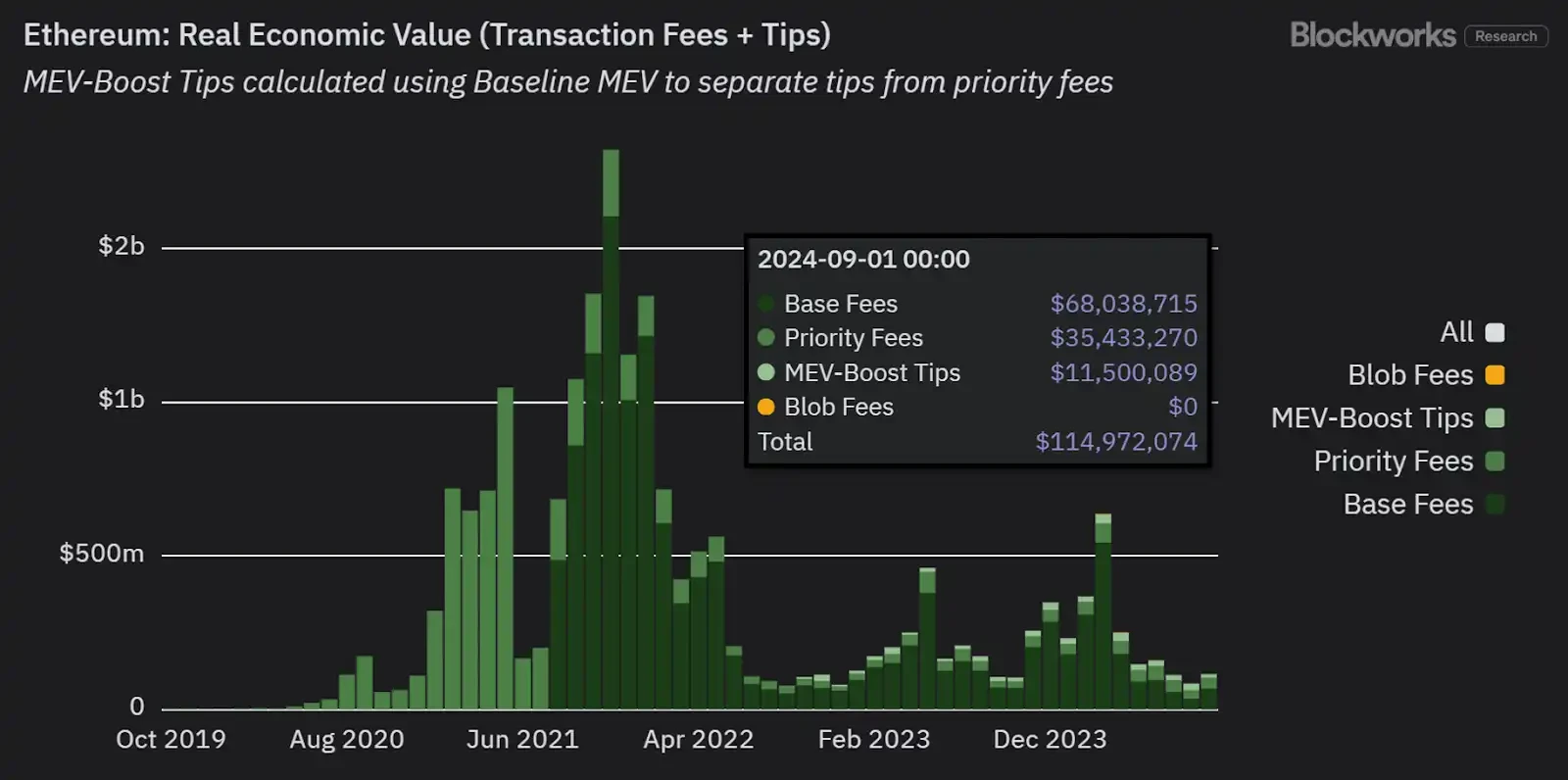 相反,我们可以考虑使用真实经济价值 (REV) 这个替代指标。REV 将网络费用和给验证者的 MEV 小费结合在一起,但不把代币发行当作成本。