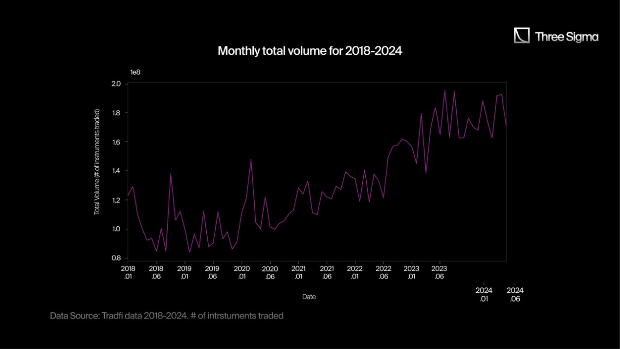 在传统金融 (TradFi) 中,散户交易者对高风险、短期期权的兴趣日益浓厚。这种转变在数据中显而易见:每周期权交易量翻了一番,从 2018 年的每周约 1 亿份合约攀升至 2024 年的 2 亿份合约。这意味着每周开仓和平仓的数量显著增加。