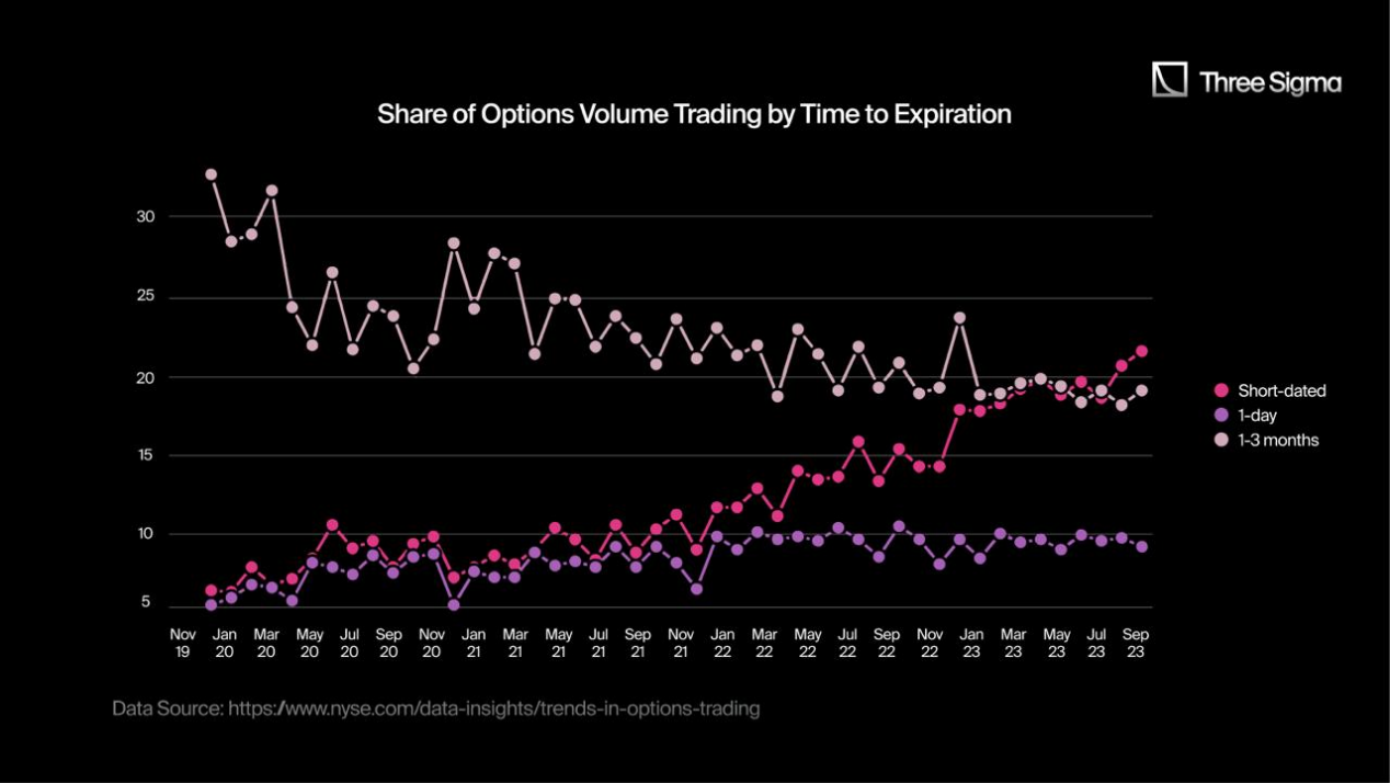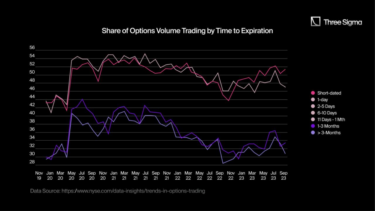 “[…] 根据我们的估计,美国股票市场期权交易量的零售份额为 […] 45% ,[…]。零售期权份额的增长最初是由 2020 年的疫情推动,随着零售期权交易者抓住短期期权押注市场走向,这一份额持续增长。低价期权的交易量份额也在增加,进一步推动了整体期权交易量,尤其是散户交易量。这些趋势似乎都没有逆转的危险。”