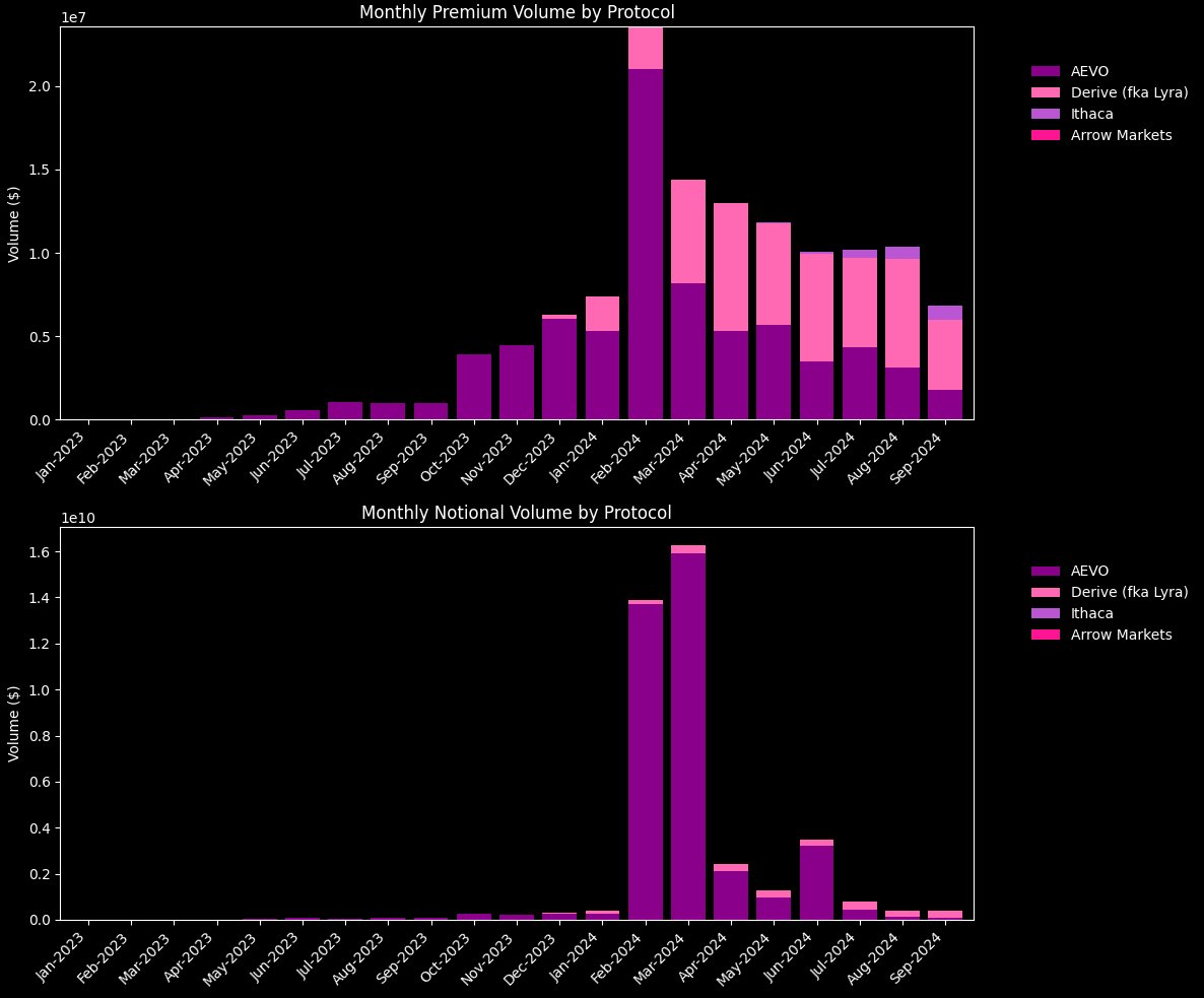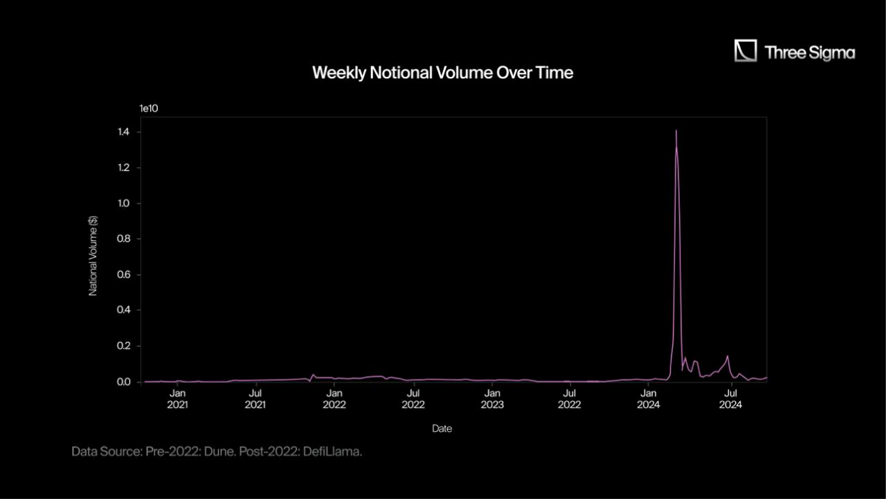 然而,到 2024 年,情况开始发生变化。新的交易所和产品的引入,如 AEVO、Derive(Lyra 的应用链)和 Stryke 等,帮助重新激起了人们对该领域的兴趣,逐渐夺回了市场份额。以下为名义交易量数据: