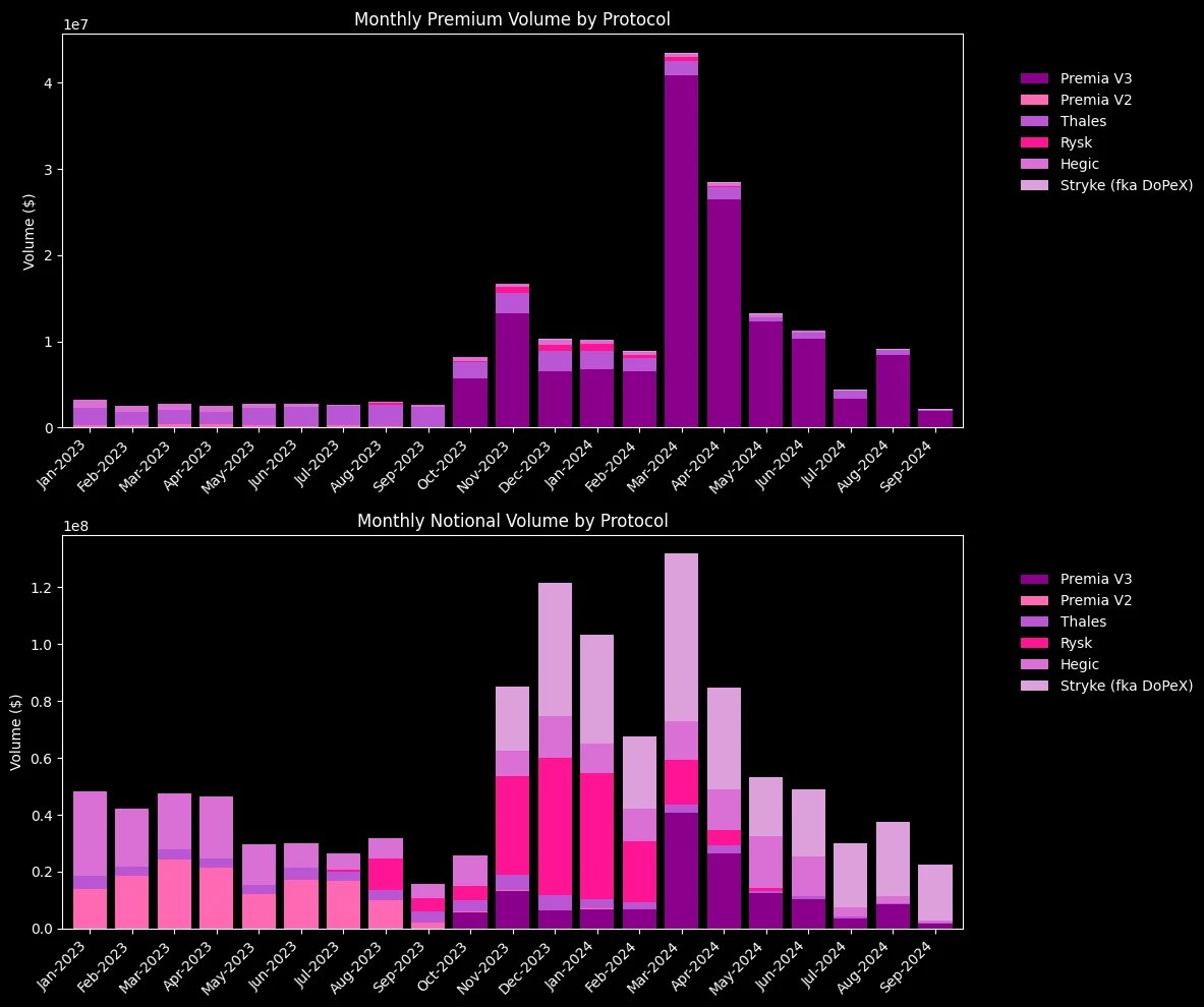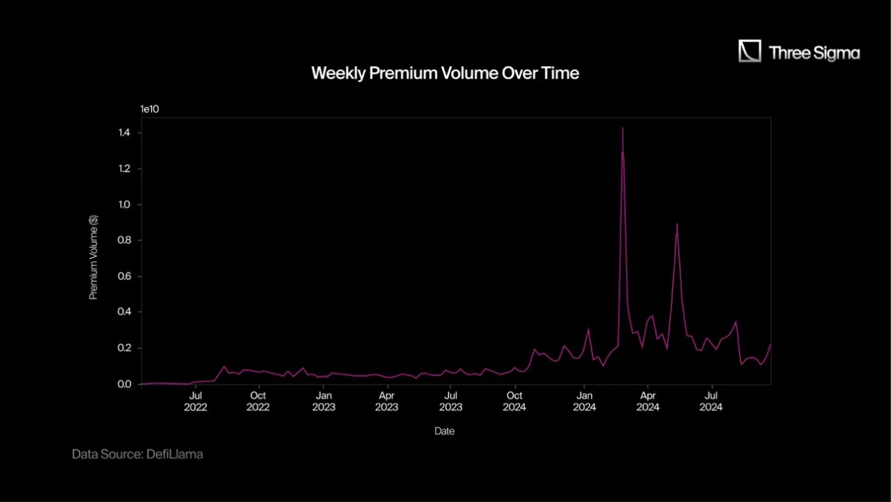 溢价交易量的增长凸显了对 DeFi 期权的新需求,因为买家愿意在 2024 年支付比前几年高得多的溢价。这反映了市场的一种转变,新产品和更复杂的策略正在推动期权领域的参与度和信心上升。
