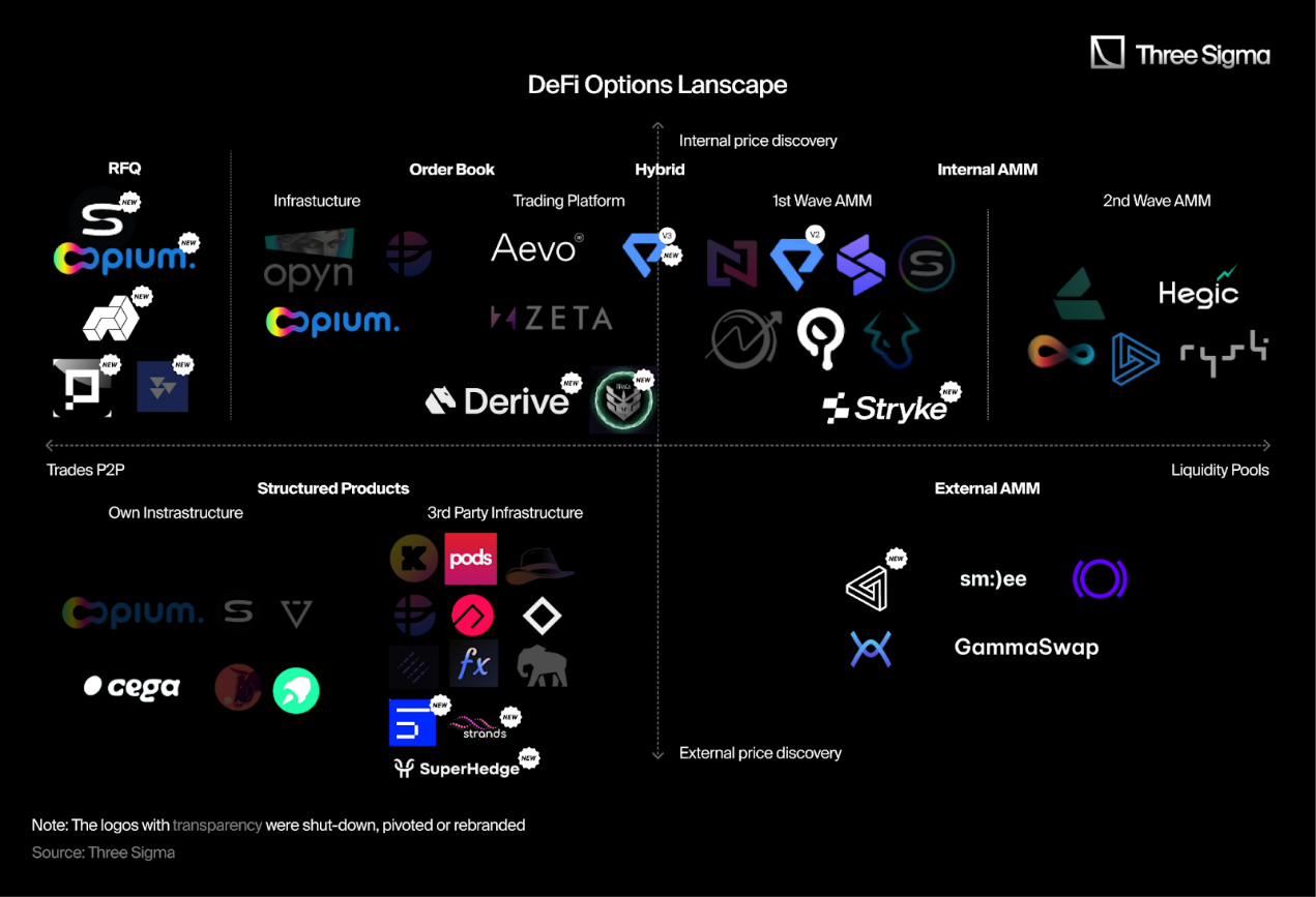 使用内部 AMM 为期权定价的协议。一些协议采用了复杂的流动性提供策略,而另一些则更简单,更多地依赖于其 LP 的风险。如今, 10 个协议中有 3 个已经转型或关闭。
