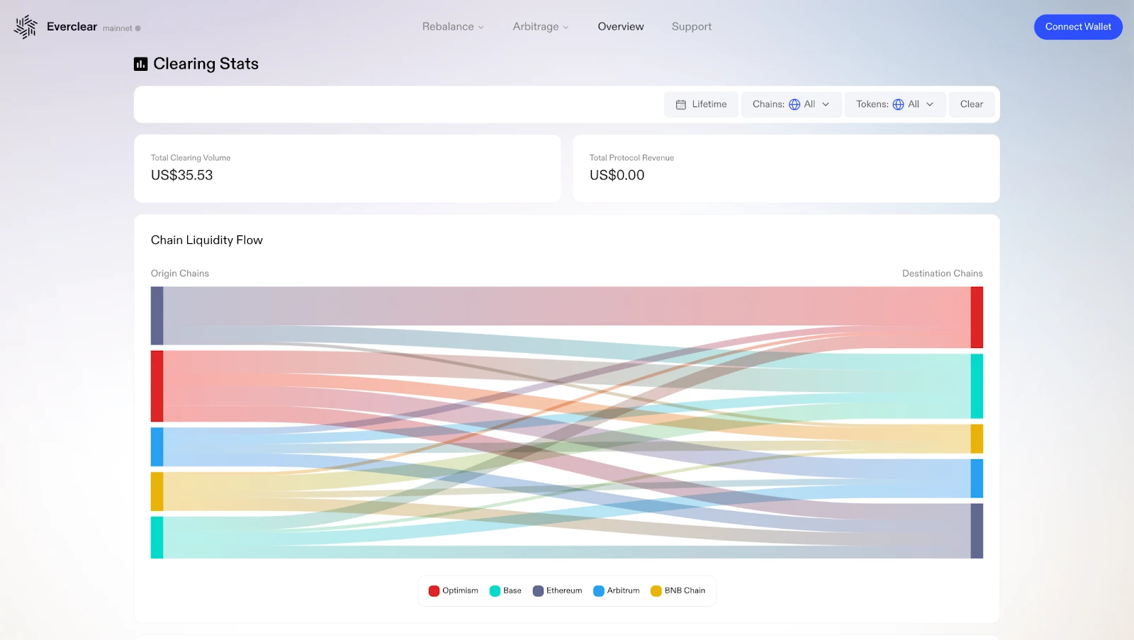 9 月中旬,Everclear 宣布启动了主网 Beta 版本。 该版本下的 Everclear 暂时覆盖了以太坊、Optimism、Base、Arbitrum、BNB Chain 等五条网络,集成了 LiFi Protocol、Router Protocol, Symbiosis、Synapse 等桥接协议。
