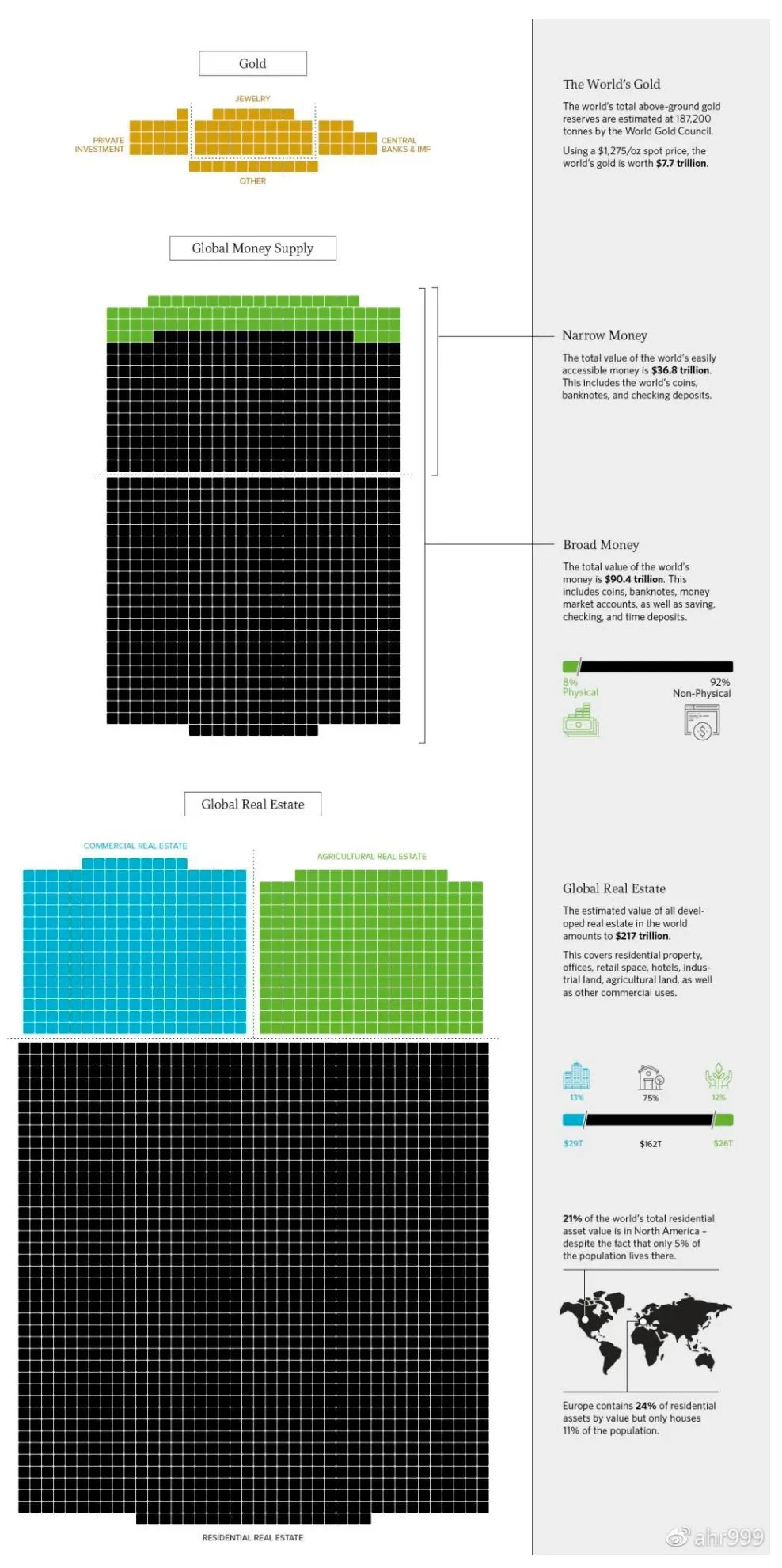 世界黄金、货币和不动产总量 (修改自 http://money.visualcapitalist.com/ )