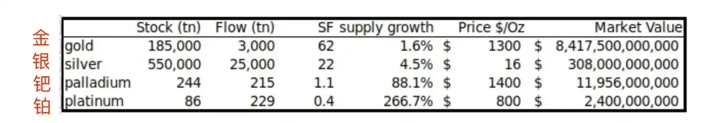 「黄金具有最高的 SF 62,需要 62 年的生产才能获得当前的黄金储备。银排名第二,具有 SF 22。这种高 SF 使它们成为货币商品。