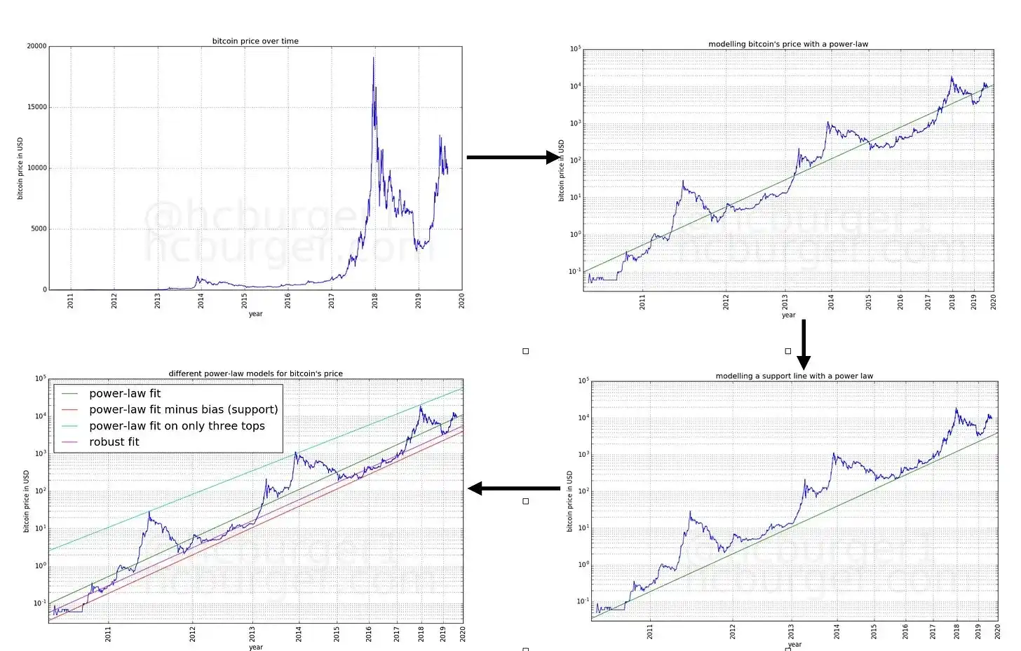 - 比特币价格在两条幂律缐之间波动:下方支撑缐和由三个市场高点定义的上方缐