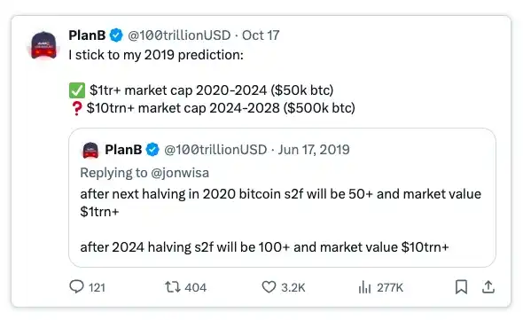 「2024 年减半后,到 2028 年比特币将达到 50 万美金,市值将达到 10 兆美元以上。」