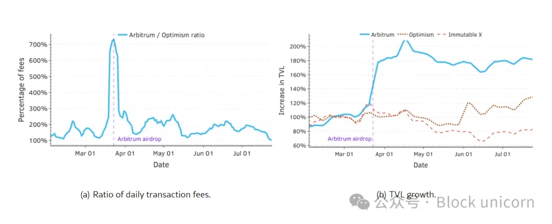 Arbitrum 的空投对其 TVL 产生了持久影响,在所有考察的指标中,TVL 是唯一在空投后显示出持久改善的指标:Arbitrum 的 TVL 在空投后立即增加了超过 50% ,并且自那时起没有显著下降,如图 6(b)所示。这或许令人惊讶,因为 Arbitrum 的空投分发策略仅考虑了 2023 年 2 月 6 日之前的用户活动。