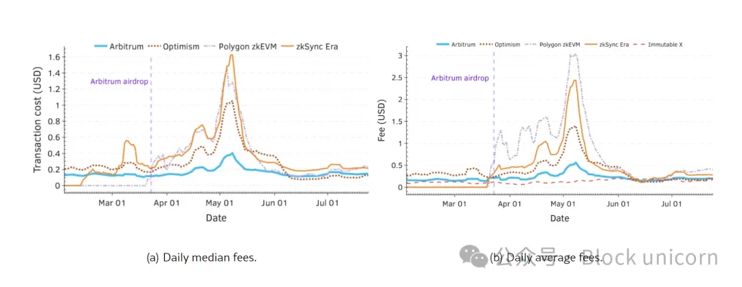 独特地址数量随时间波动。独特地址数量表现出波动行为,迅速上升、达到峰值后又下降。值得注意的是,Optimism 和 Arbitrum 在相对地址数量上表现出相反的阶段,这可能是由于用户在费用上涨时在协议之间切换。然而,在中位交易费用上没有此类模式,Arbitrum 在 2023 年 5 月中旬的费用始终较低。然而,独特地址数量这一指标可能被操控。根据我们的分析,Arbitrum 的空投并未导致用户的长期参与,因为独特地址指标容易被操控。用户可以创建多个地址以利用空投限制。这使得这一指标在衡量真实活动时不够可靠,因为大幅波动可能源于此类行为。此外,空投软件的易得性使得此类活动的自动执行更加方便。因此,应该考虑使用其他更抗 Sybil 的指标来评估真实用户参与,例如结合图网络分析和机器学习技术。