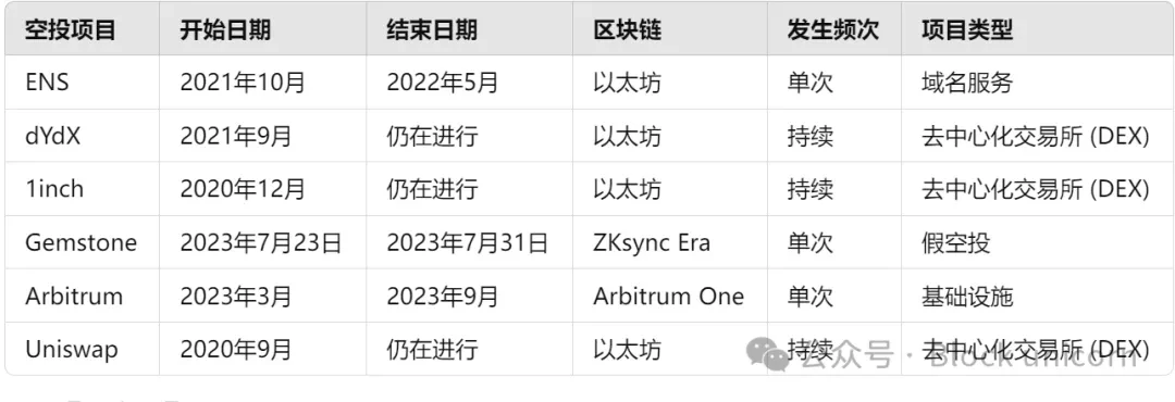 表 1 ,这个表格展示了六个空投项目的开始日期、结束日期、所在区块链、空投类型以及项目类型。