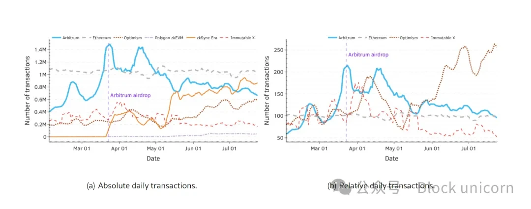 图 4 :(a)直接显示了每个平台每天的交易次数,(b)将每个平台的每日交易次数与 Arbitrum 空投前的平均值进行了比较,让我们更直观地看到空投活动对交易数量的影响。