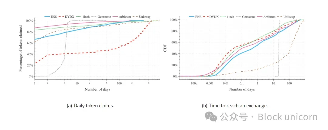 图 1 :空投后代币认领和转移模式的比较:(a)每日代币认领情况;(b)到达交易所所需的时间。