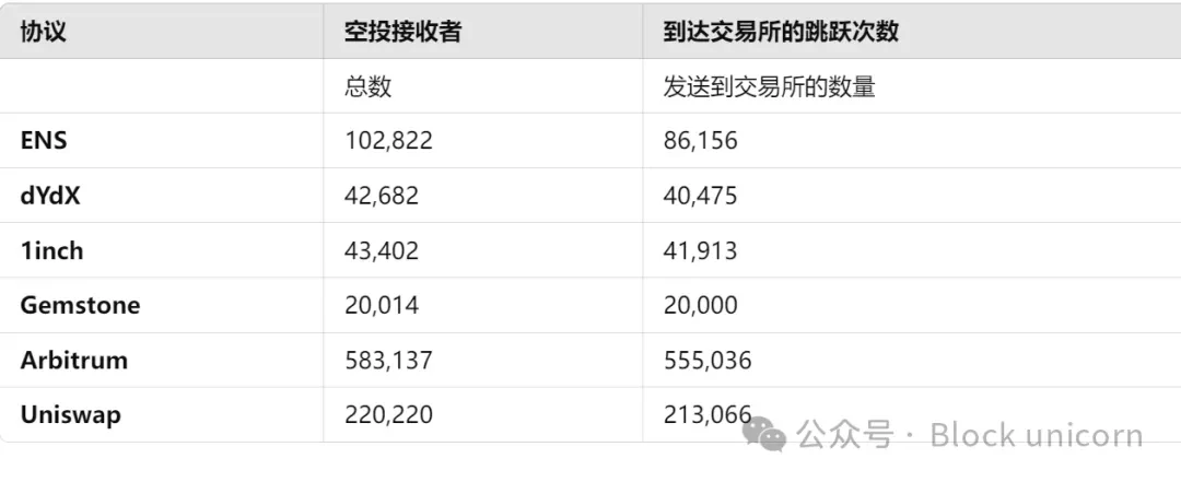表 3. Gemstone 和 1inch 是例外,中位数为 1 次跳转到交易所,而其他协议显示将空投接收者与交易所连接的中位数为 2 次跳转。
