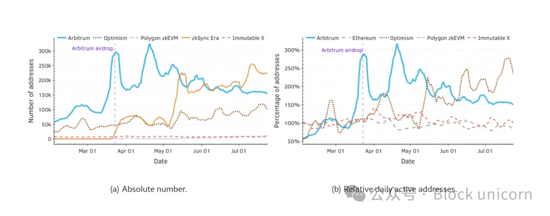 图 2: 每个协议的每日活跃地址数,(a)直接显示了每个平台每天有多少个不同的用户;(b)将每个平台的每日活跃用户数量与 Arbitrum 空投前的平均值进行了比较,让我们更直观地看到空投活动对用户活跃度的影响。