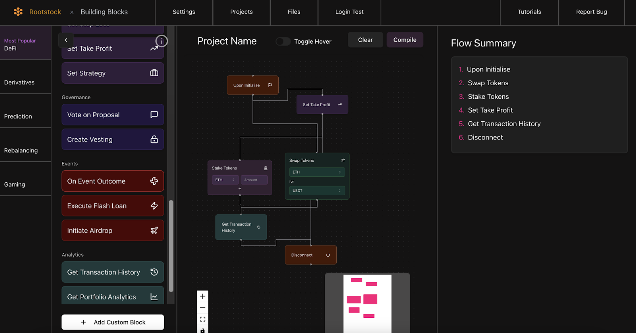 BuildBlocks 创建了拖放式(drag-and-drop)智能合约组件,任何人都可以在 Rootstock 上开发、编译和部署经过审计的合约,从而使 Web3 开发变得简单而安全。