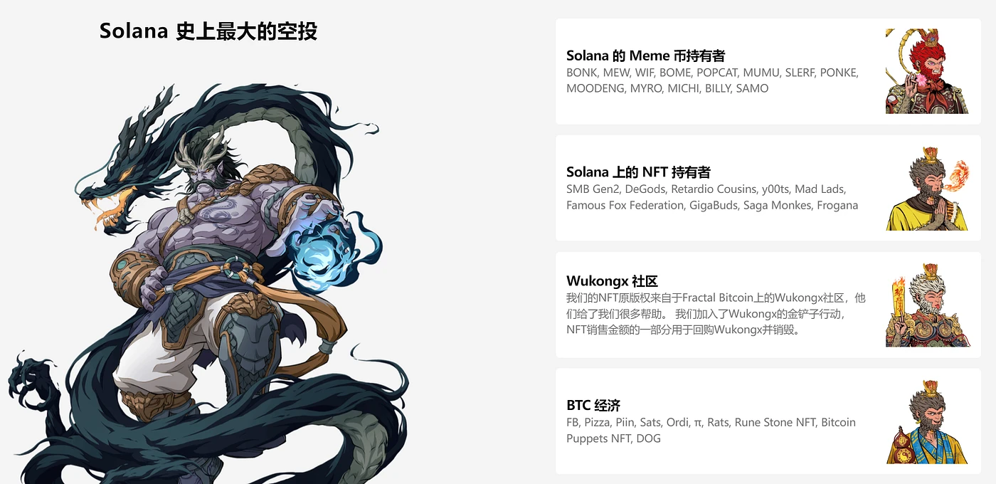 根据项目推特消息,Wukong 正在开展“Solana 上大规模空投活动,预计覆盖数 100 万用户,涉及 Solana Meme 币、Solana NFT、Solana 手机、Raydium 活跃用户、BTC 生态和 Wukongx 社区。这次空投活动有望让 Wukong 成为 Solana 链上持币用户最多的项目之一。