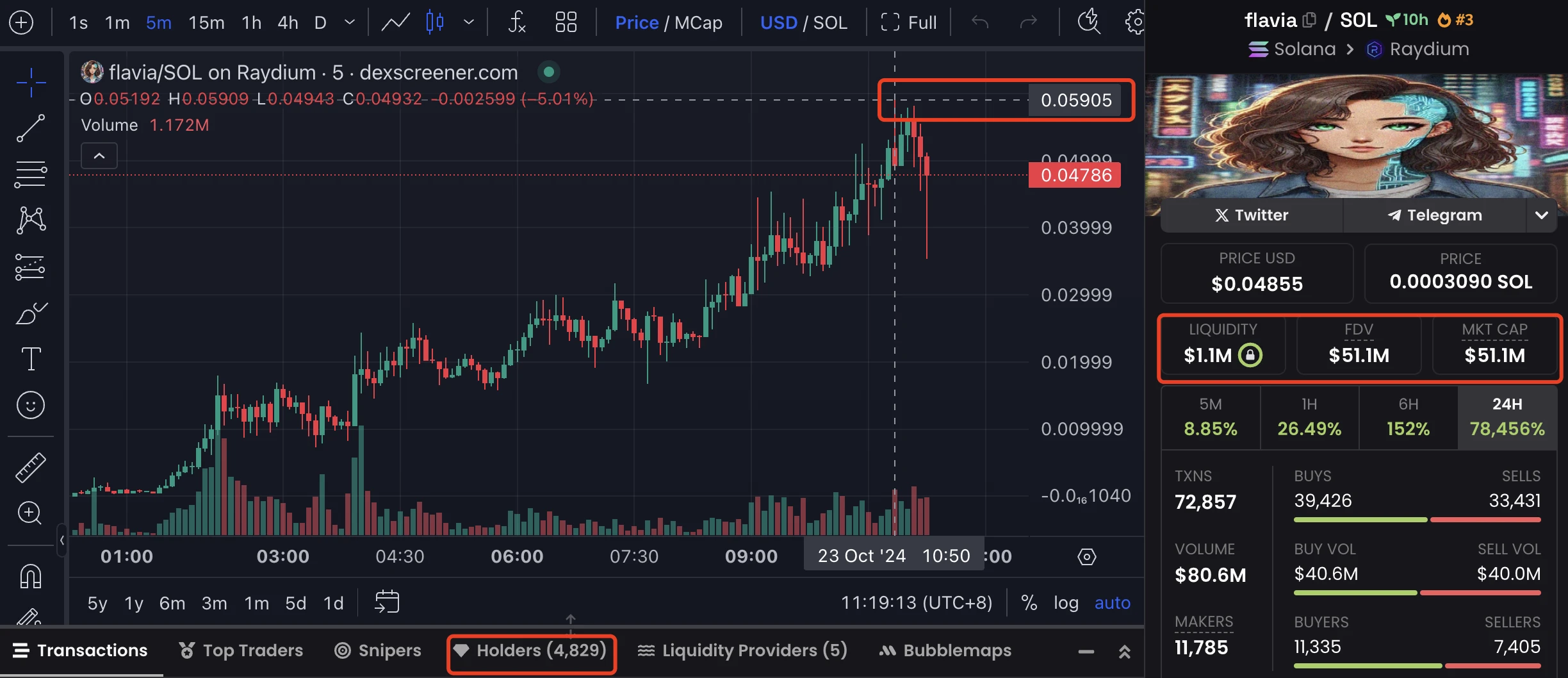 随着消息的不断扩散,市场对 FLAVIA 的热情迅速助推该项目市值一路走高,截止撰稿时,根据 Dexscreener 网站信息 ,FLAVIA 价格为 0.048 美元左右,市值一度突破 5000 万美元,高点价格一度接近 0.06 美元左右,持仓人数为 4800 个钱包地址。