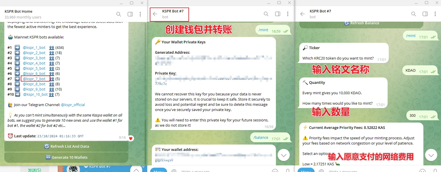 此外,KSPR 的模式为一次付费,任务完成后结算,并且 Bot 无法识别铭文是否已打到上限,需要用户手动停止铸造 、结算并取回剩余的 Kas。