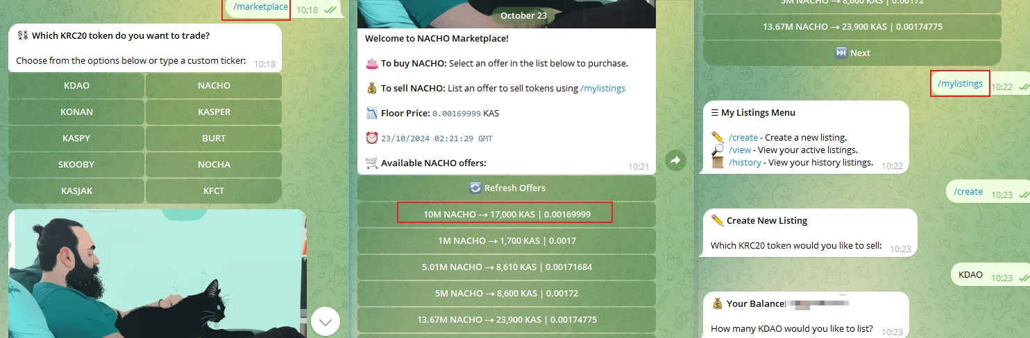 交易方面,最主流的交易市场同样在 KSPR 中,用户可通过/marketplace 命令进入,点击对应挂单进行购买。若需要出售则可通过/mylistings 命令进入挂单菜单,进行挂单的创建和管理。