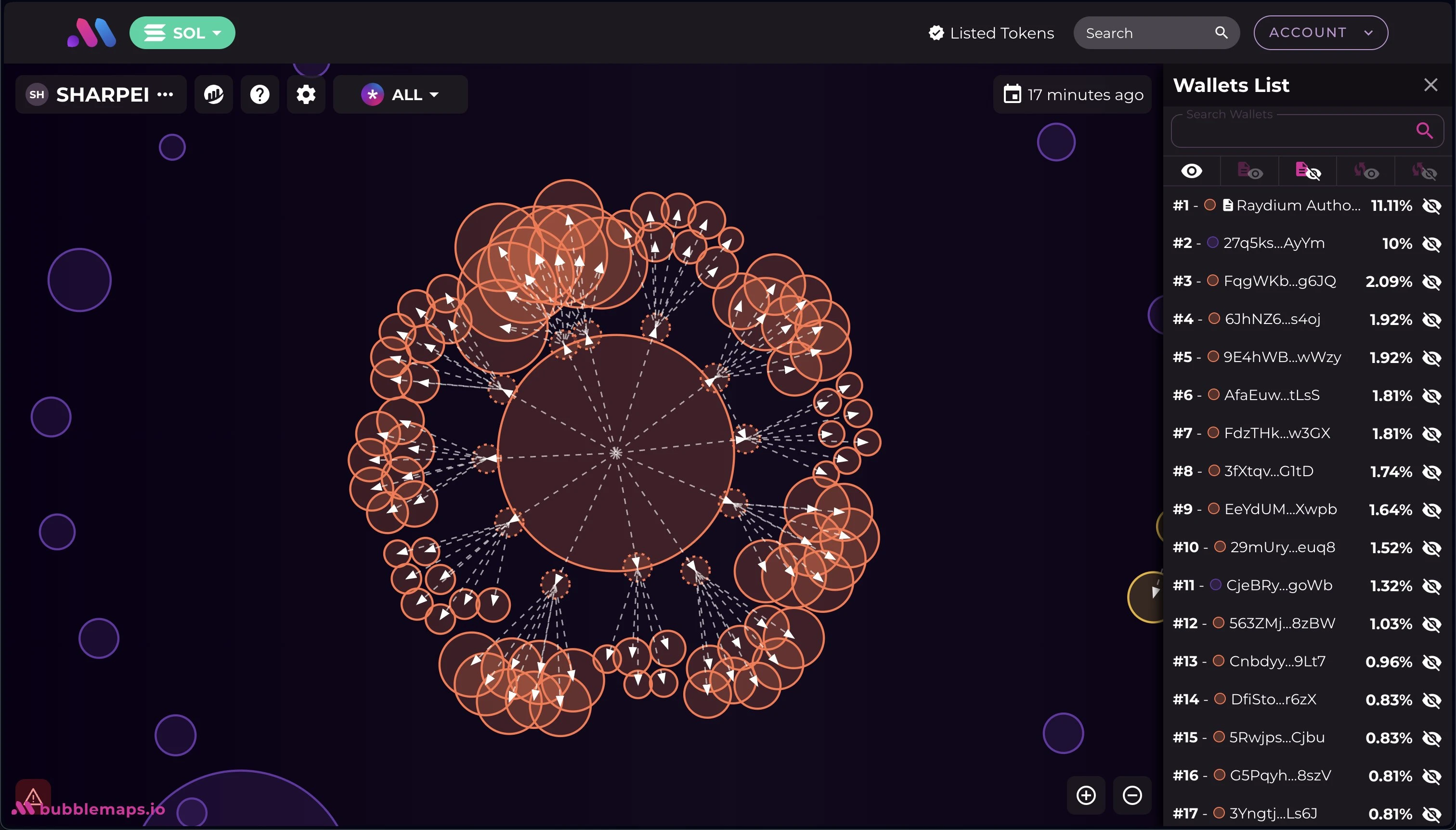 同时,据 Bubblemaps 监测,之前 60% 的 SHAR 被归集并分散到 100 多个地址,这表明 SHAR 项目方为了操纵市场价格,通过在不同地址间转移代币,制造出活跃交易的假象,以吸引散户的关注。
