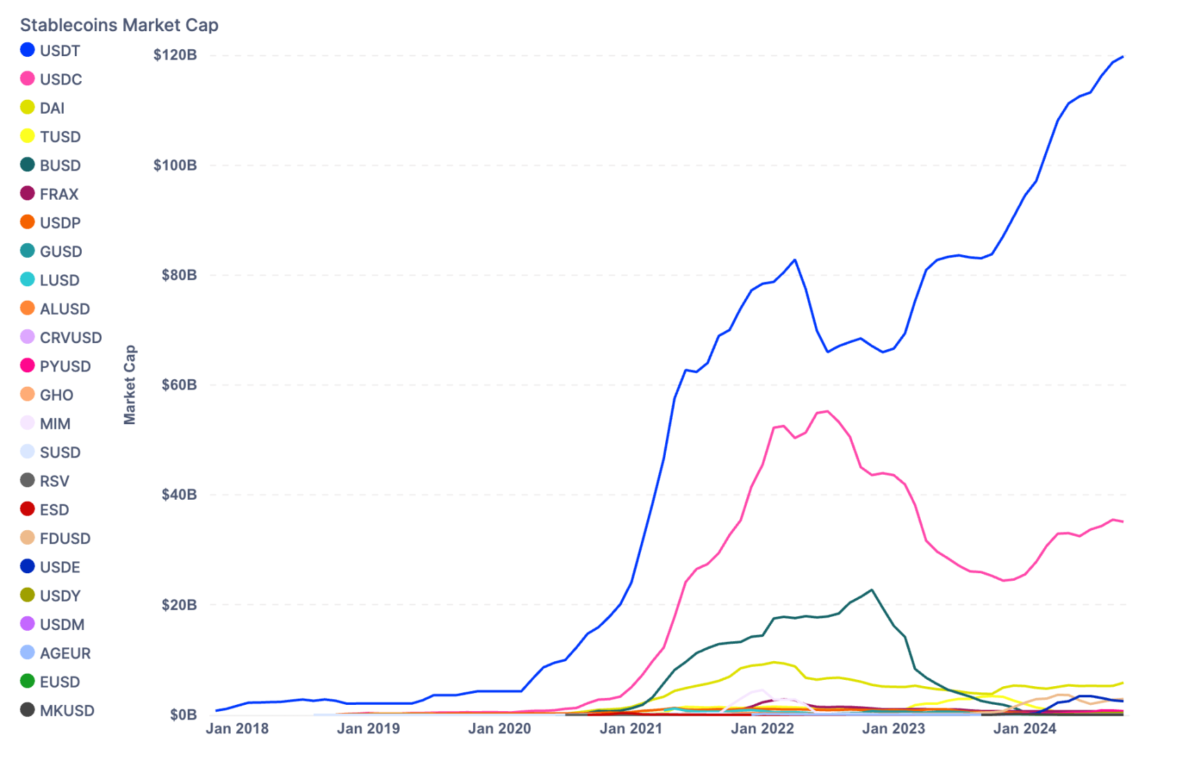 稳定币总市值以抢走以太坊份额的方式增加了其份额占比,排除其他山寨币的因素,其占 BTC、ETH 和稳定币总市值的比重在 2024 年从 7% 增长到 10% 。据 DefiLlama 数据显示,稳定币总市值现报 1727.78 亿美元,创自 2022 年 5 月以来新高。